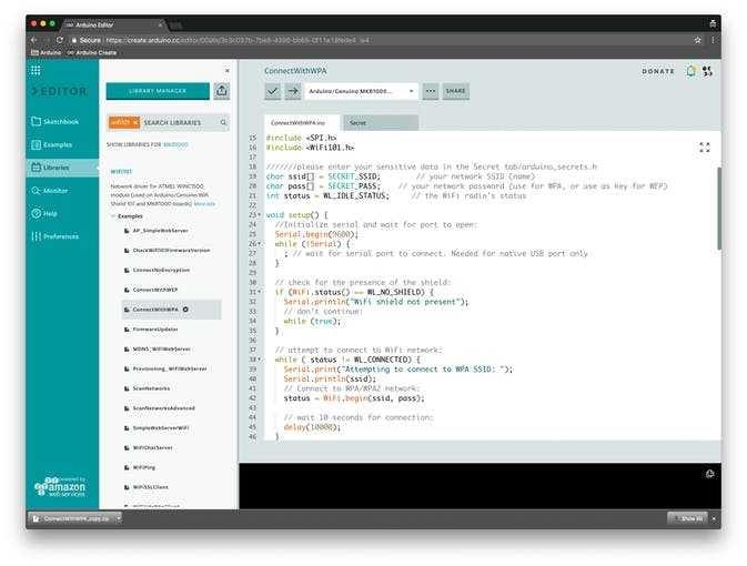 Go to the Libraries panel and type ‘Wifi101’ in the search tab, then click on the ConnectWithWPA example. You can also click on this link and add the example to your sketchbook.
