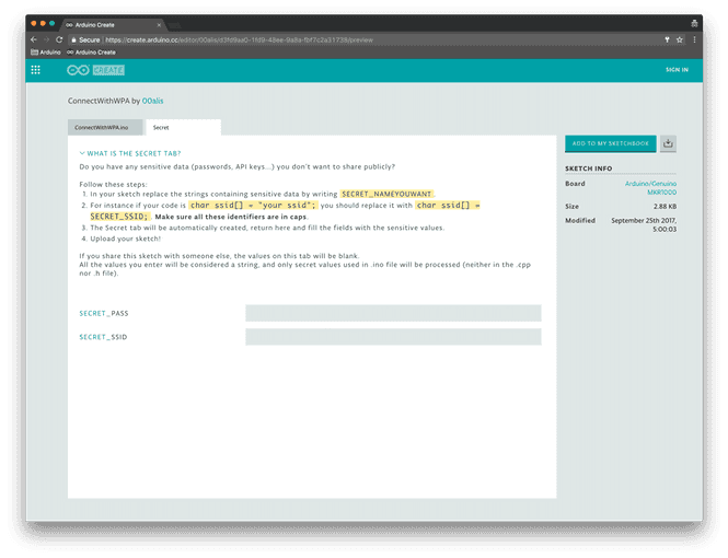 Often in your sketch, there is some sensitive data that you’d like to keep private, which could accidentally become public when published on GitHub or when you share your sketch with someone else via URL. This sensitive information may include Wi-Fi network names and passwords, API key, and so on. But now, you can add a secret tab to your sketch and store your private data there.