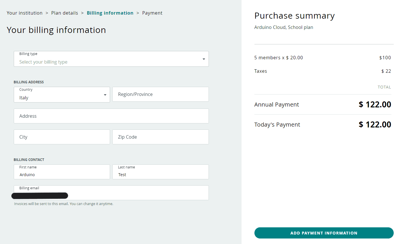Then click on the button Add Billing Information and fill in with your educational institution information and payment method.