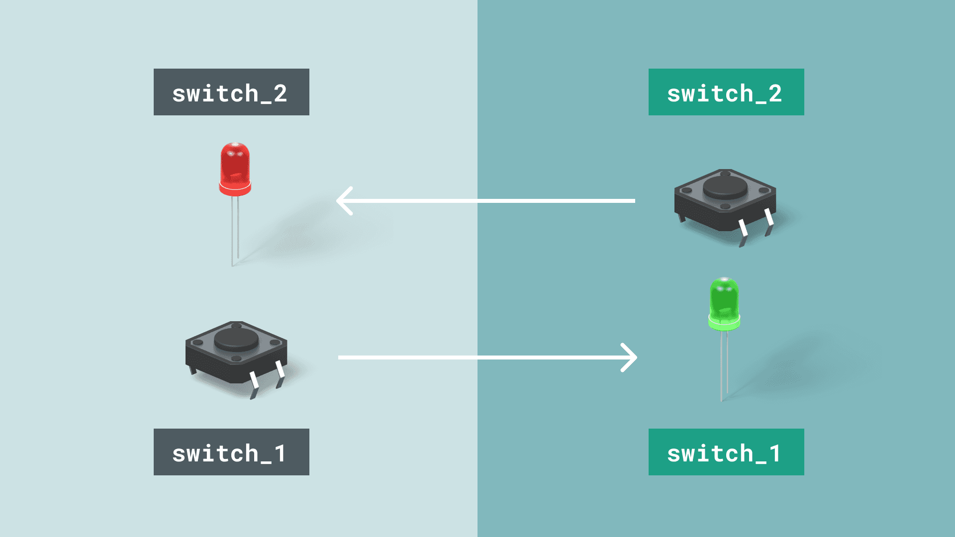 Two identical circuits with 1x button and 1x LED each.