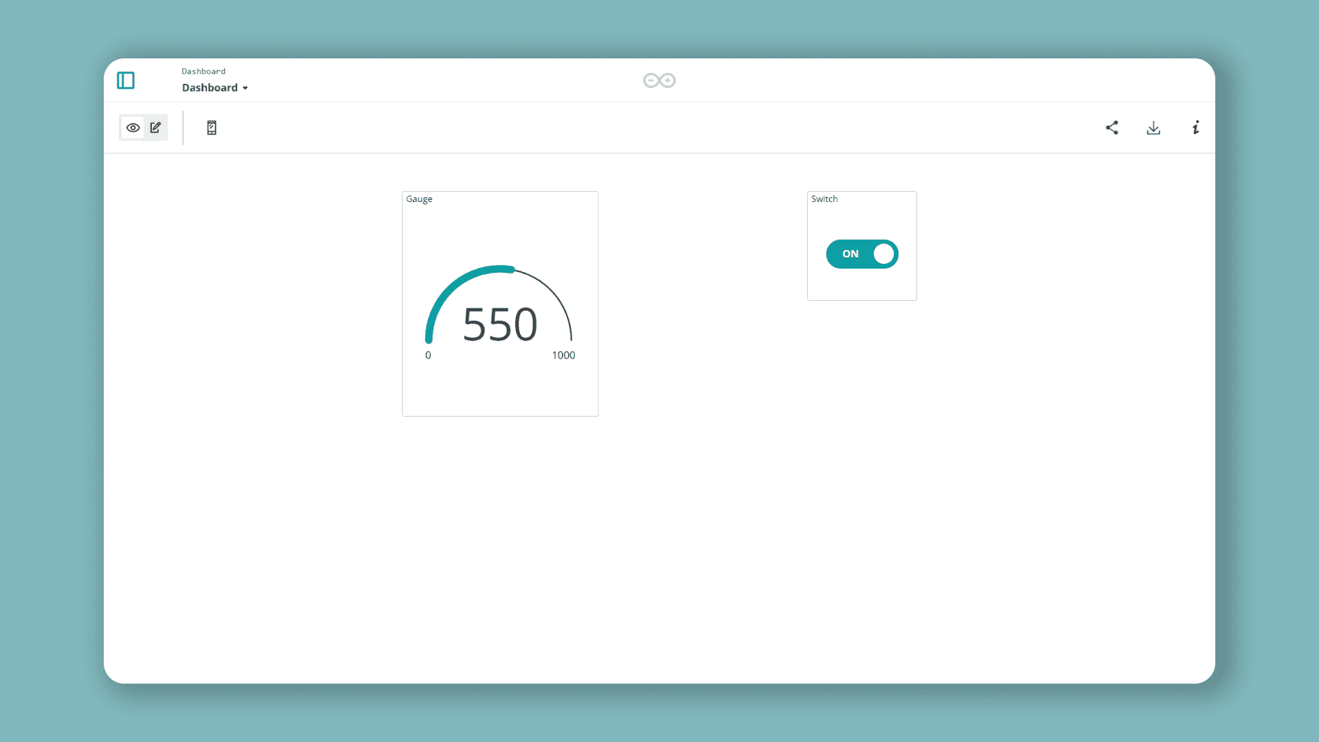 Our widget will now appear in the dashboard. Next, let's add a Switch widget, following the same process to link it to the boolean_sync variable inside Thing Number One. After adding it, we will have two widgets: a gauge and a switch.