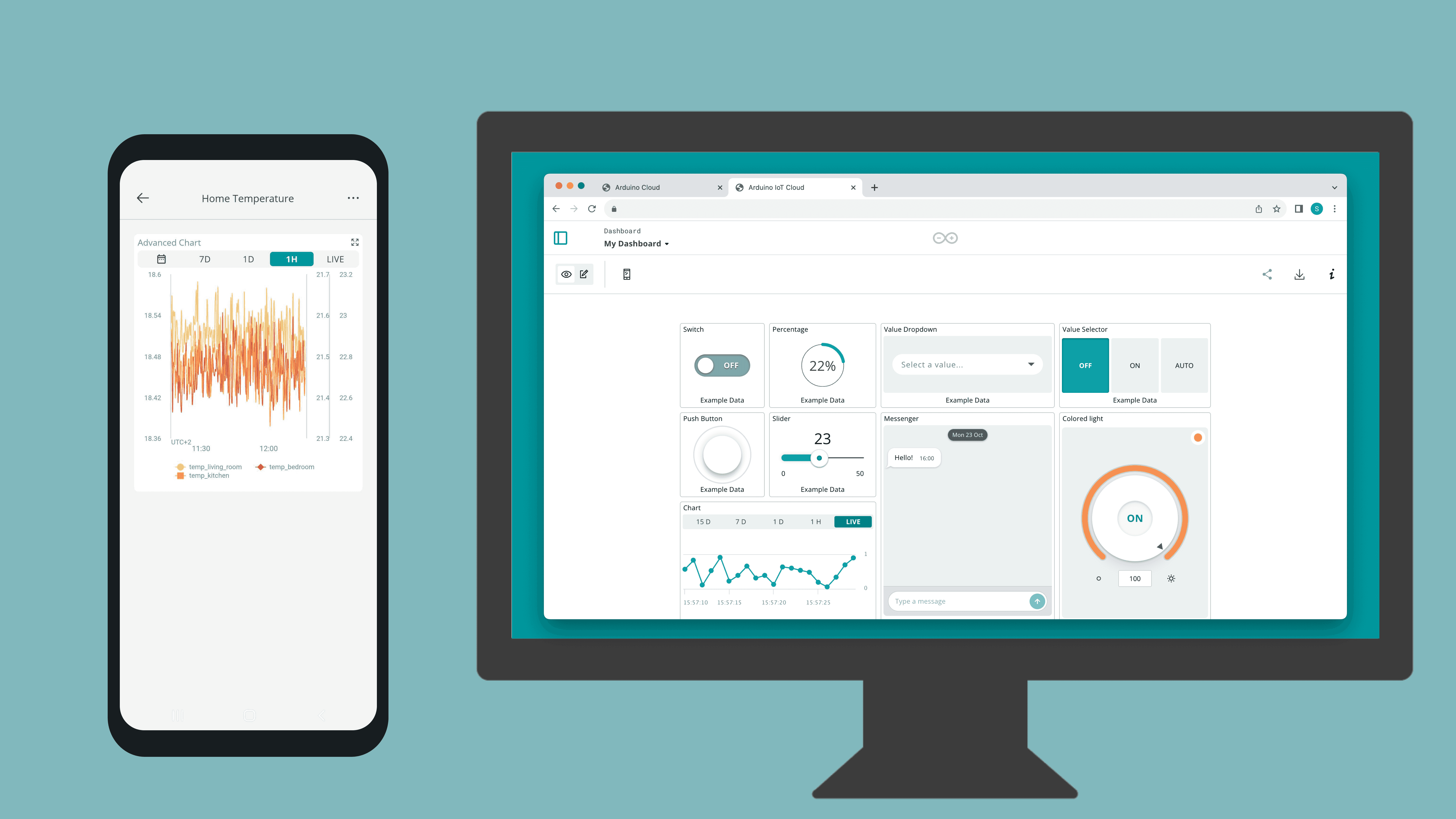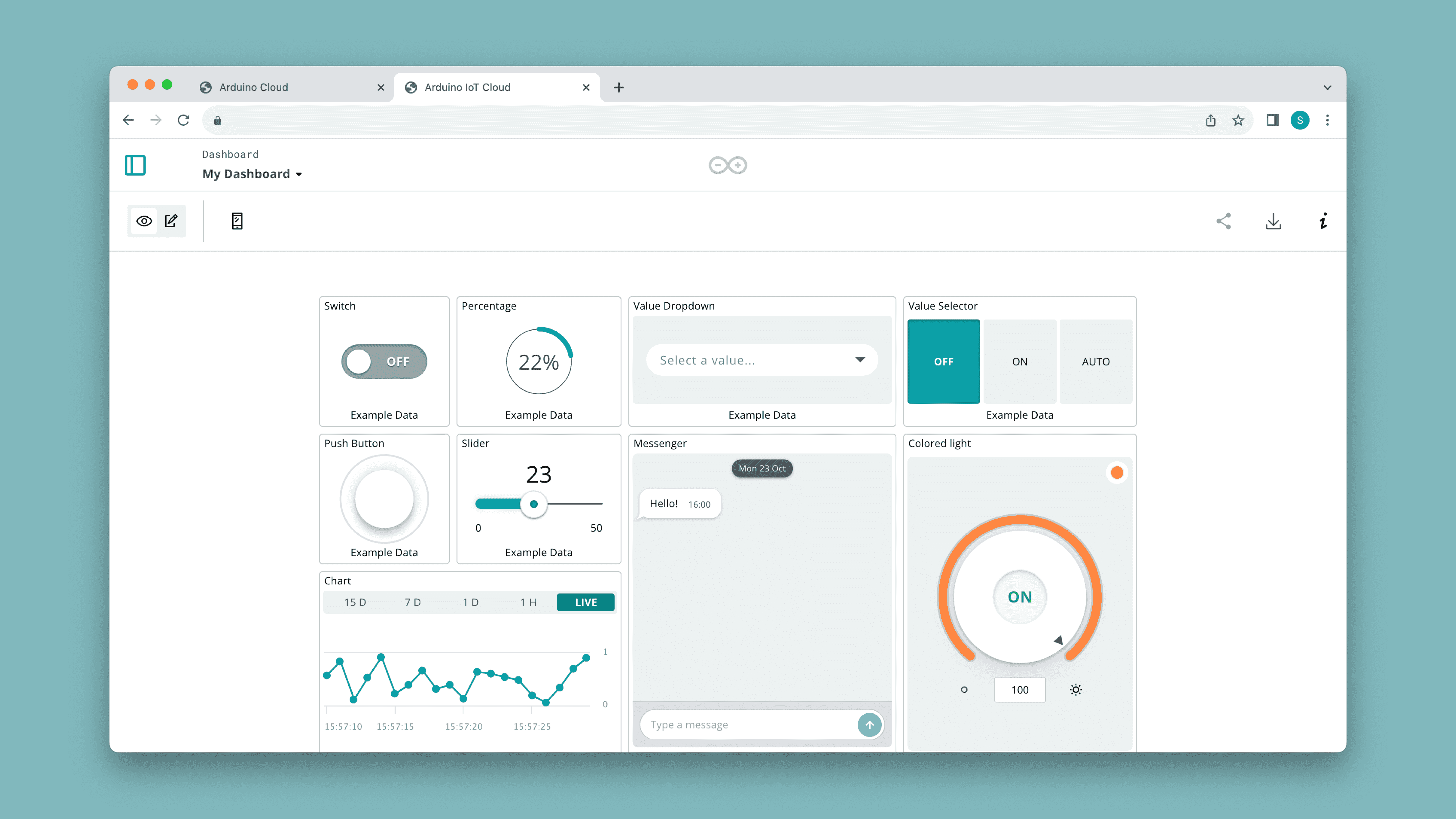 Choose from switches, sliders, RGB picker, message box, gauges and much more to create dashboards. Dashboards are not linked to a specific Thing/device, meaning you can control many different boards from the same dashboard.