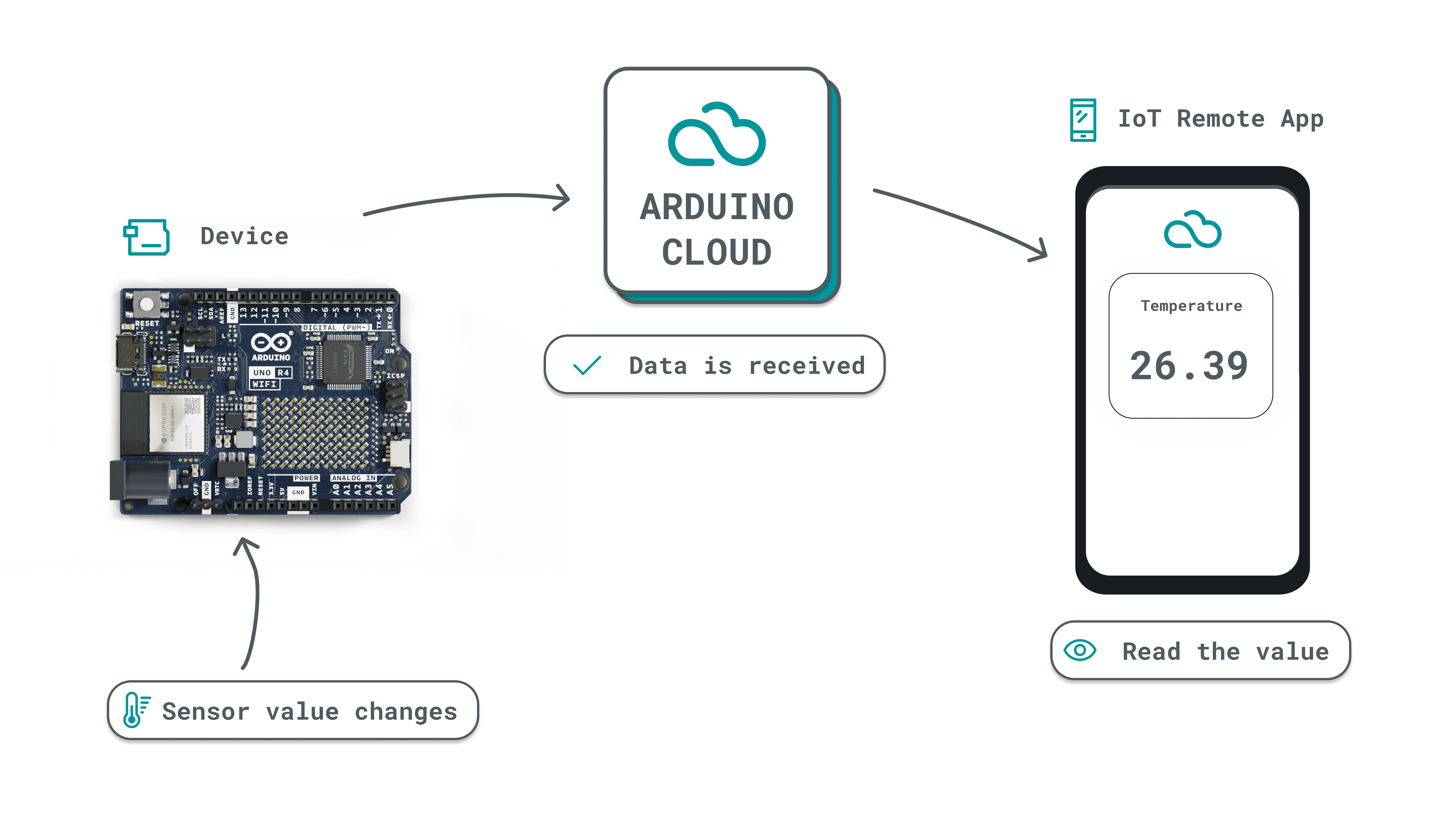 Once a variable is synced to the Arduino Cloud you can access it from any of your other devices connected to the Arduino Cloud.