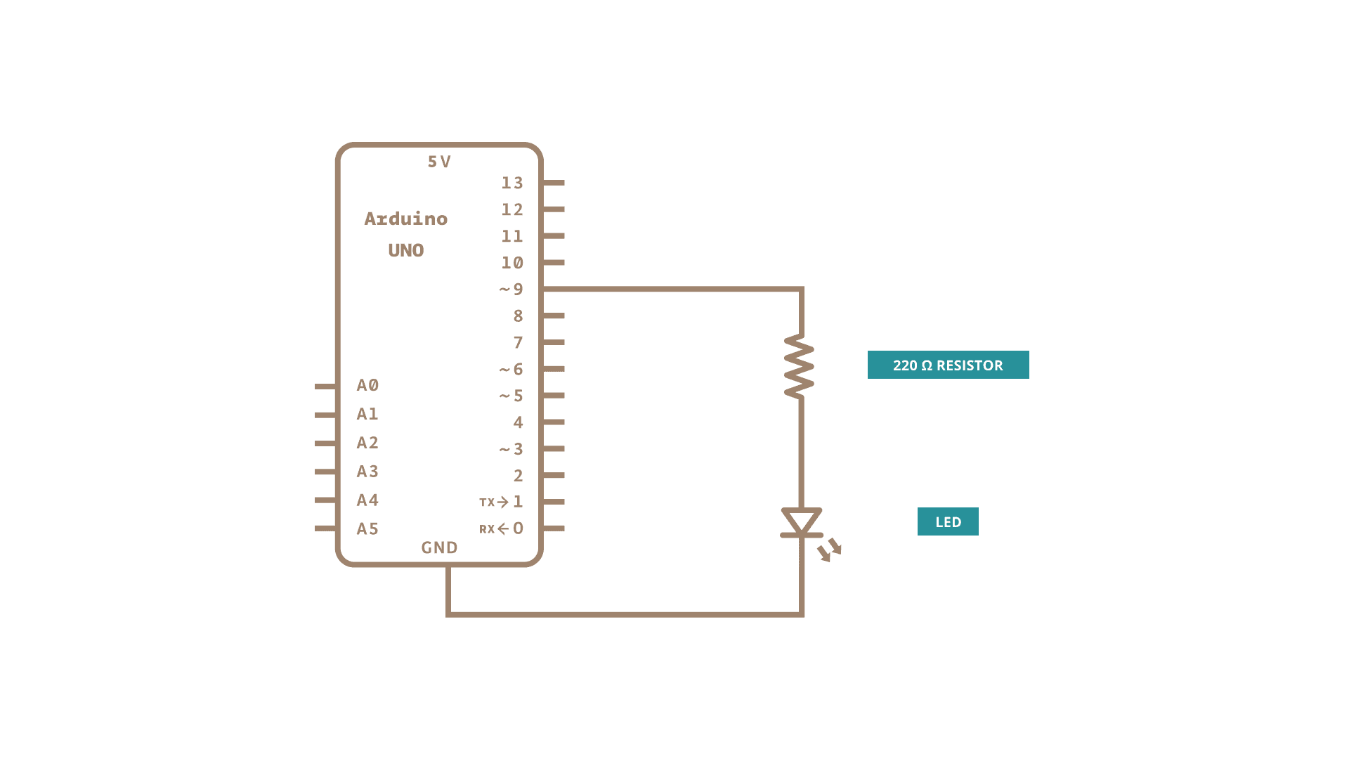 Connect the anode (the longer, positive leg) of your LED to digital output pin 9 on your board through a 220 ohm resistor. Connect the cathode (the shorter, negative leg) directly to ground.