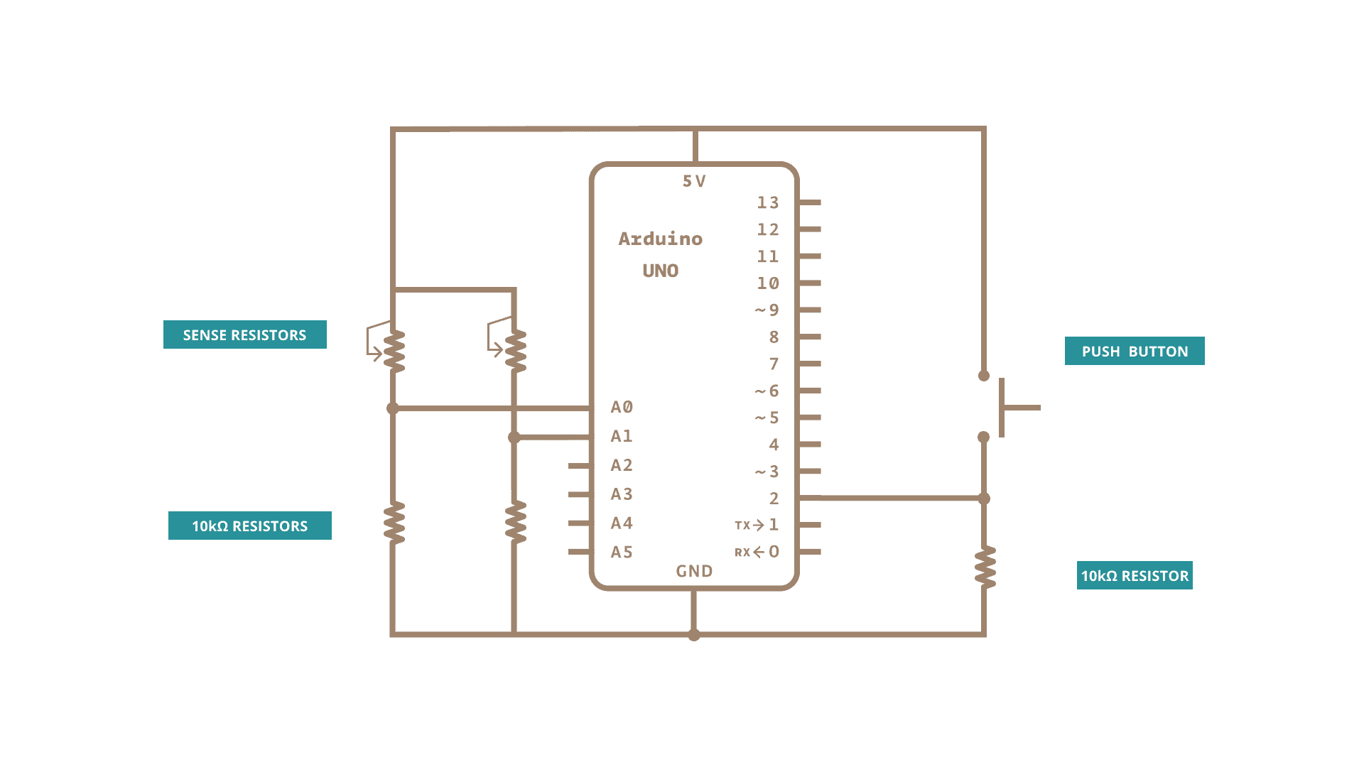 Connect analog sensors to analog input pin 0 and 1 with 10K ohm resistors used as voltage dividers. Connect a pushbutton or switch to digital I/O pin 2 with a 10K ohm resistor as a reference to ground.