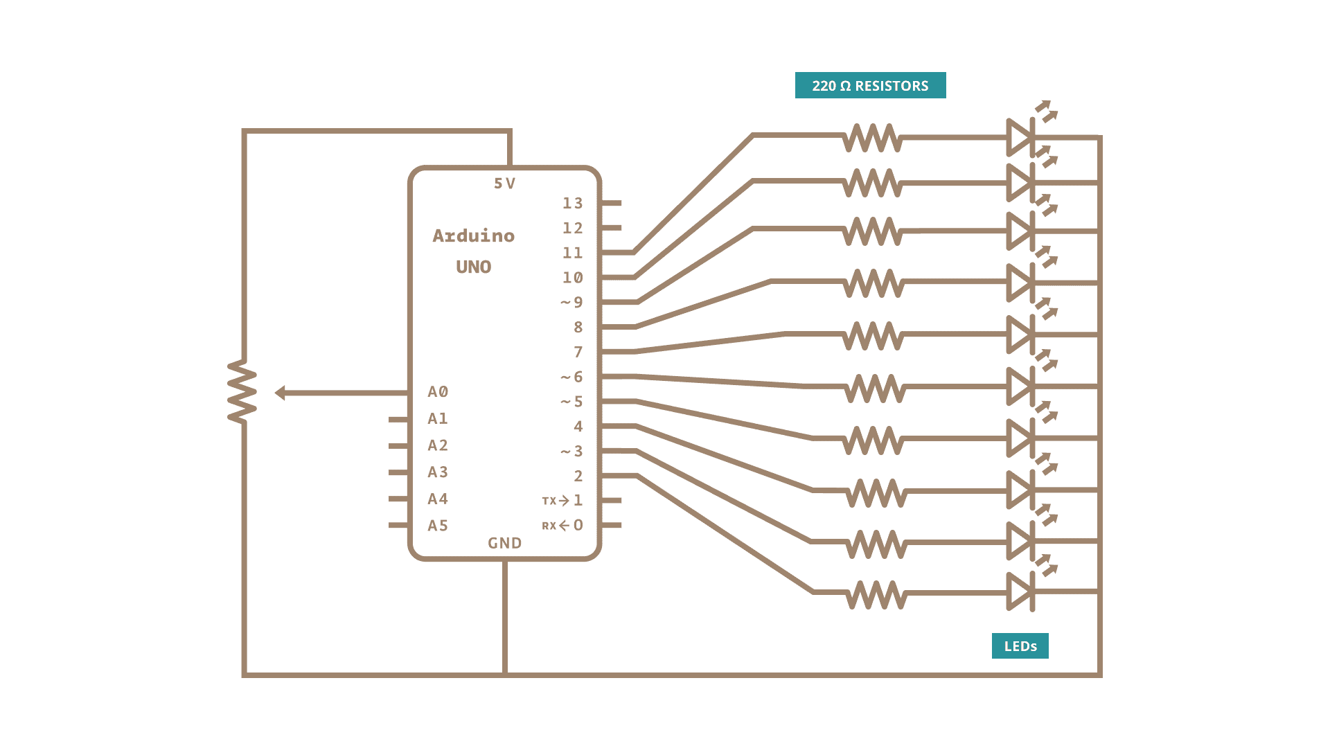The bar graph - a series of LEDs in a line, such as you see on an audio display - is a common hardware display for analog sensors. It's made up of a series of LEDs in a row, an analog input like a potentiometer, and a little code in between. You can buy multi-LED bar graph displays fairly cheaply, like this one. This tutorial demonstrates how to control a series of LEDs in a row, but can be applied to any series of digital outputs.
