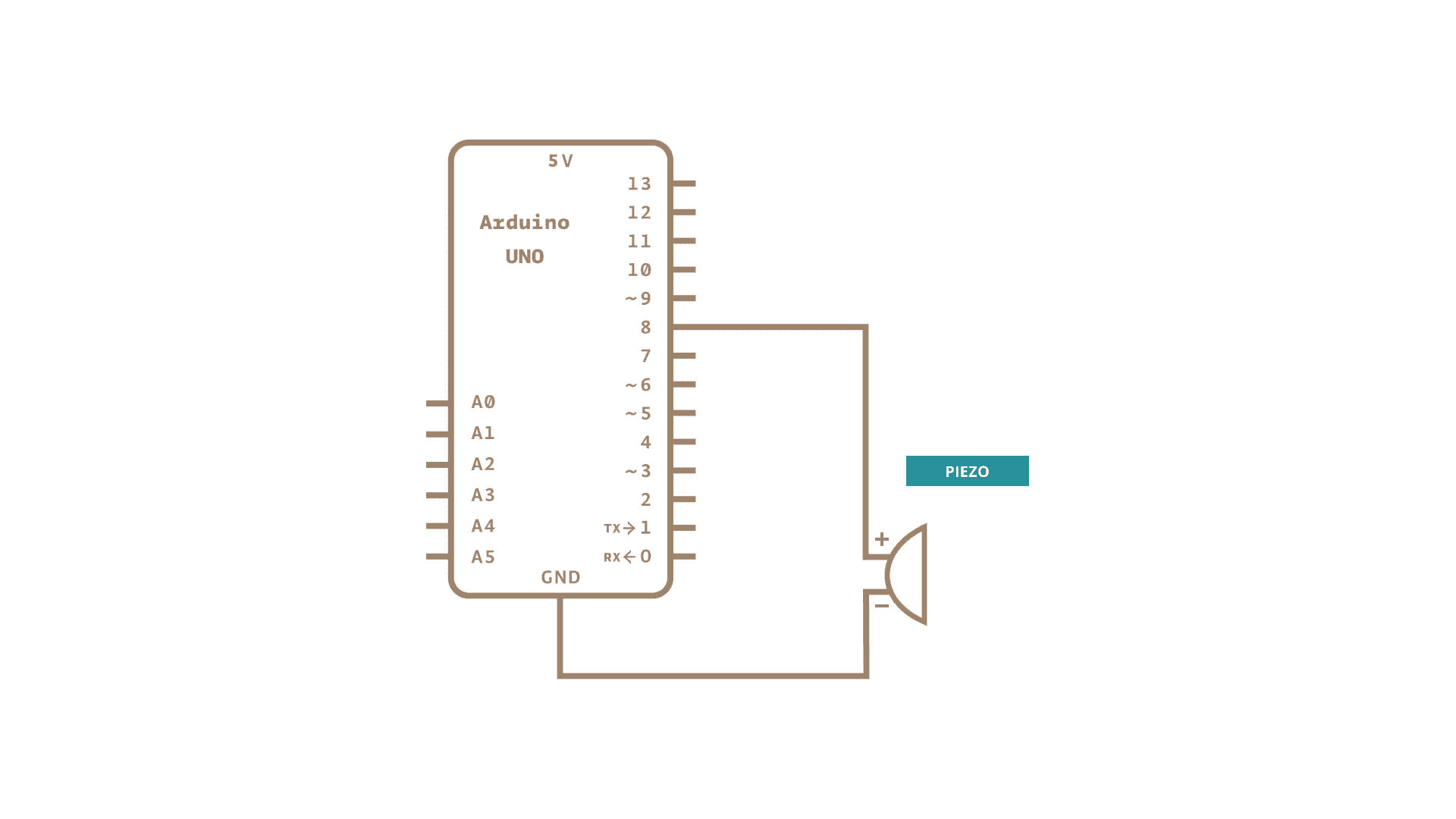 Most times a piezo buzzer is used to produce sounds with an Arduino. When voltage is applied to a piezoelectric ceramic material it causes it to vibrate rapidly, resulting in the generation of sound waves. Every wave has an associated property called frequency which measures how many cycles happen every second. This unit of cycles is called Hertz (Hz). E.g., A middle C on the piano has a frequency of 262 Hz which means that the air oscillates back and forth 262 times every second.