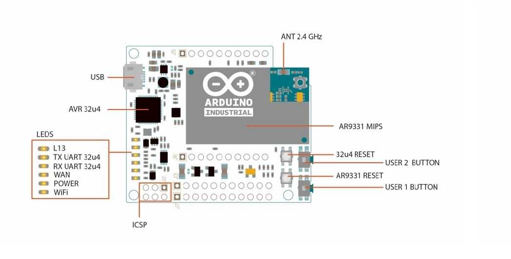 Arduino Industrial 101 is an Evaluation board for Arduino 101 LGA module. The ATmega32u4 microcontroller is integrated in the baseboard. The module supports a Linux distribution based on OpenWRT named LininoOS. The board has built-in WiFi (IEEE 802.11b/g/n operations up to 150Mbps 1x1 2.4 GHz), 3 GPIOs (of which 2 can be used as PWM Outputs), 4 Analog Inputs, 1 USB, 1 Ethernet signal on pin headers and a built-in DC/DC converter. Check out the assembling guide and simply connect your board to a computer with a micro USB cable to get started.