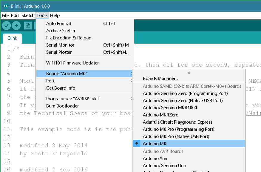 The Arduino M0 is programmed using the Arduino Software (IDE), our Integrated Development Environment common to all our boards and running both online and offline. For more information on how to get started with the Arduino Software visit the Getting Started page.
