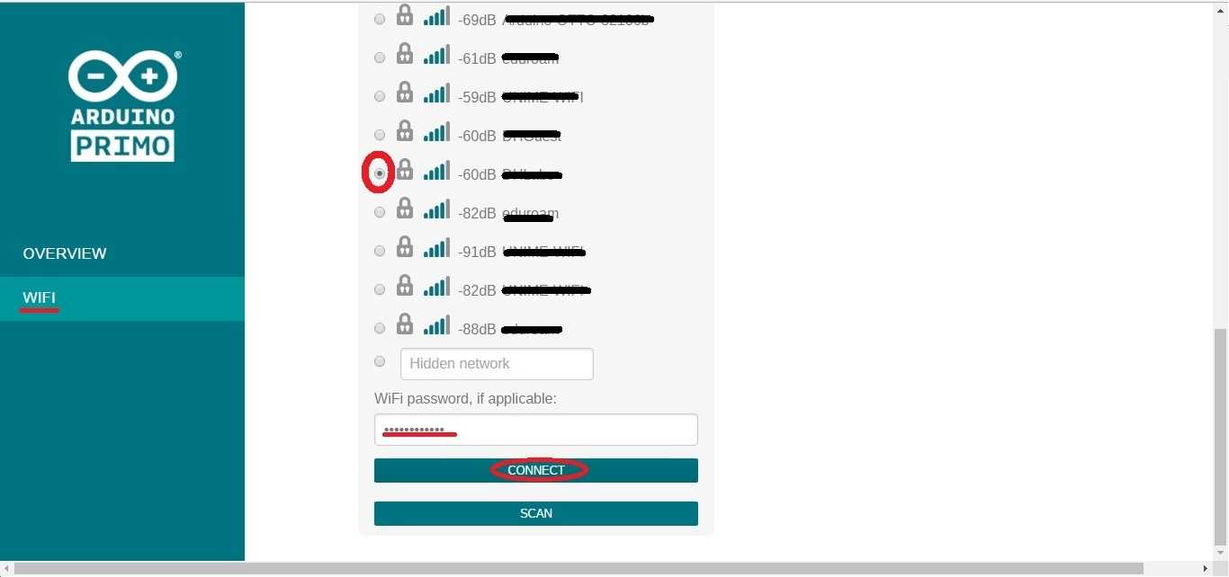 Connect the Arduino Primo to yours Access Point Router, selecting your network from WiFi Connection Menu. Type the correct password and click on CONNECT, as shown in the below image: