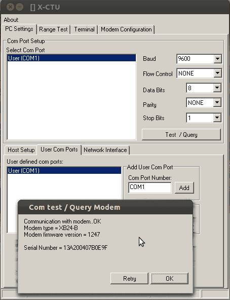 Open the X-CTU software and type the Arduino XBee module's COM port number into the "Com Port Number" field. Then click the Add button. The COM port you created will appear in the two text boxes on the left. Select both and then click the "Test / Query" button, will appear a screen like this:
