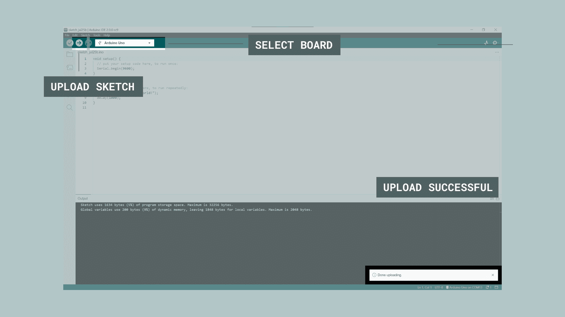 2. Now, we need to create a sketch that includes some configurations needed, so that our board can communicate with our computer. Mainly, we need to set a baud rate, which is done by writing