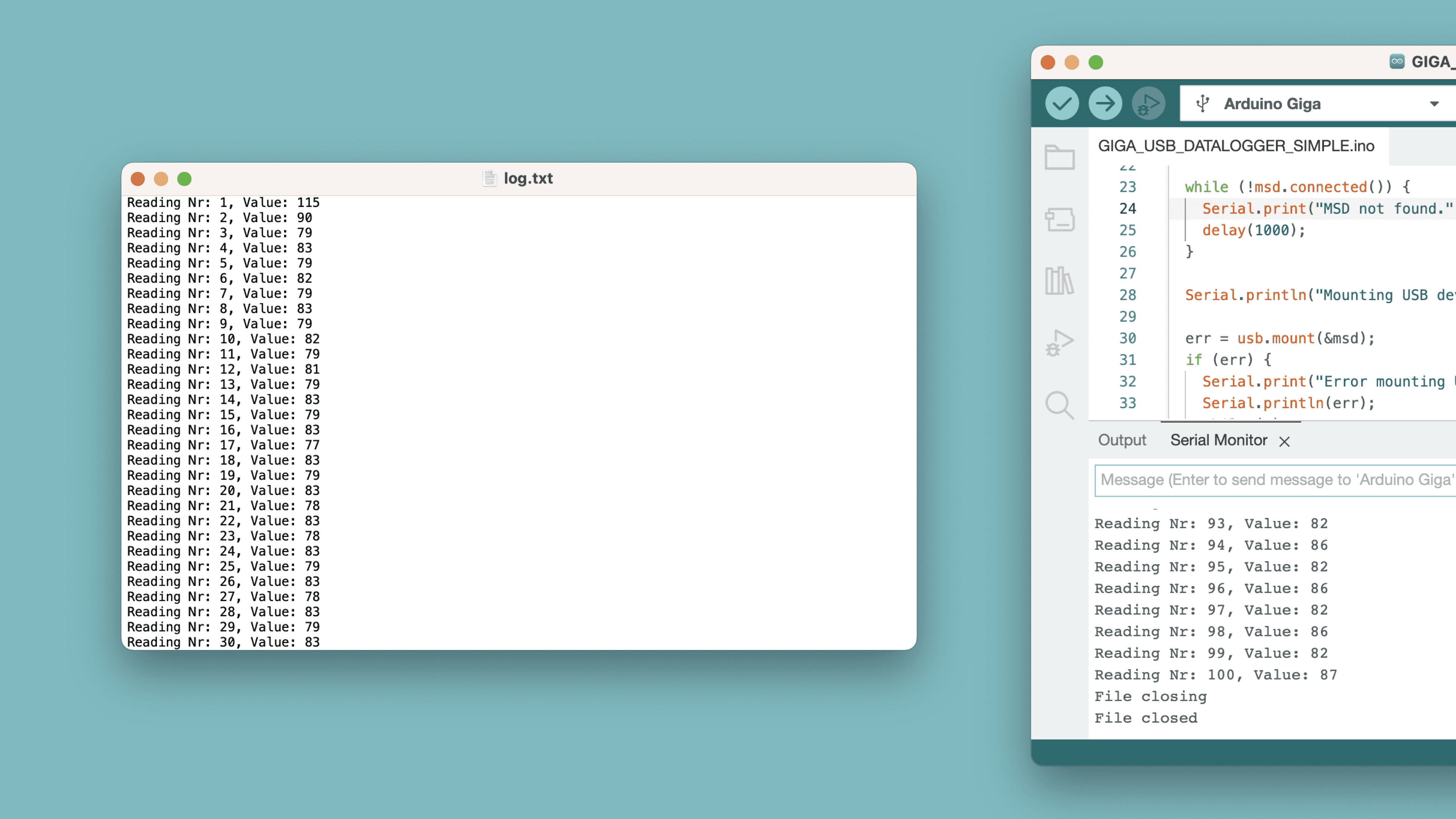 30 err = usb.mount(&msd);31 if (err) {32 Serial.print("Error mounting USB device ");33 Serial.println(err);34 while (1)35 ;36 }37 Serial.print("read done ");38 39 //function to write to file40 WriteToFile();41}42