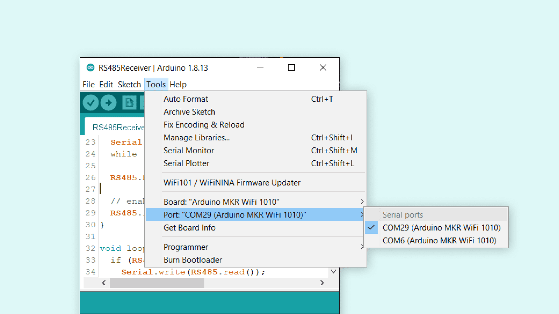Now that we have uploaded the sketches to our sender and receiver boards, we can test the setup by opening the Serial Monitor for the receiver device. This is done by navigating to Tools > Port, and selecting the device you uploaded the receiver sketch to. In this case, the receiver device is COM29.