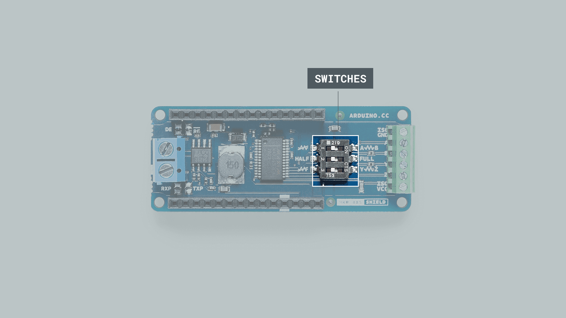 We will then need to make some configurations to the switches mounted on top of the MKR 485 Shield. There are three in total, and individually only have two modes: ON or OFF.