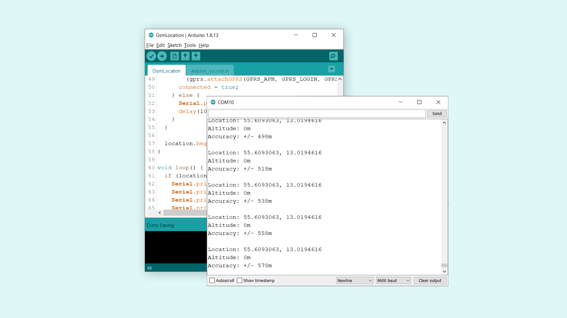 The sketch can be found in the snippet below. You can also find the sketch in File > Examples > MKRGSM > GsmLocation. Upload the code to the board, and make sure the right board and port are selected.