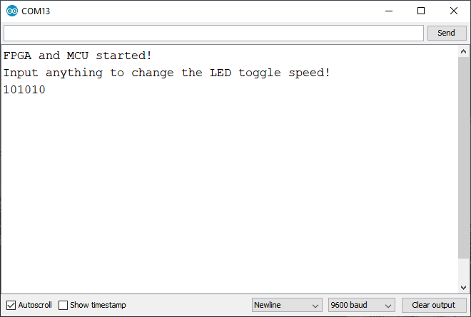 It's worth mentioning that you can also use the JTAG pads on the board to upload the code to the FPGA directly. Once the code uploads, you should see something similar to this in the serial monitor:
