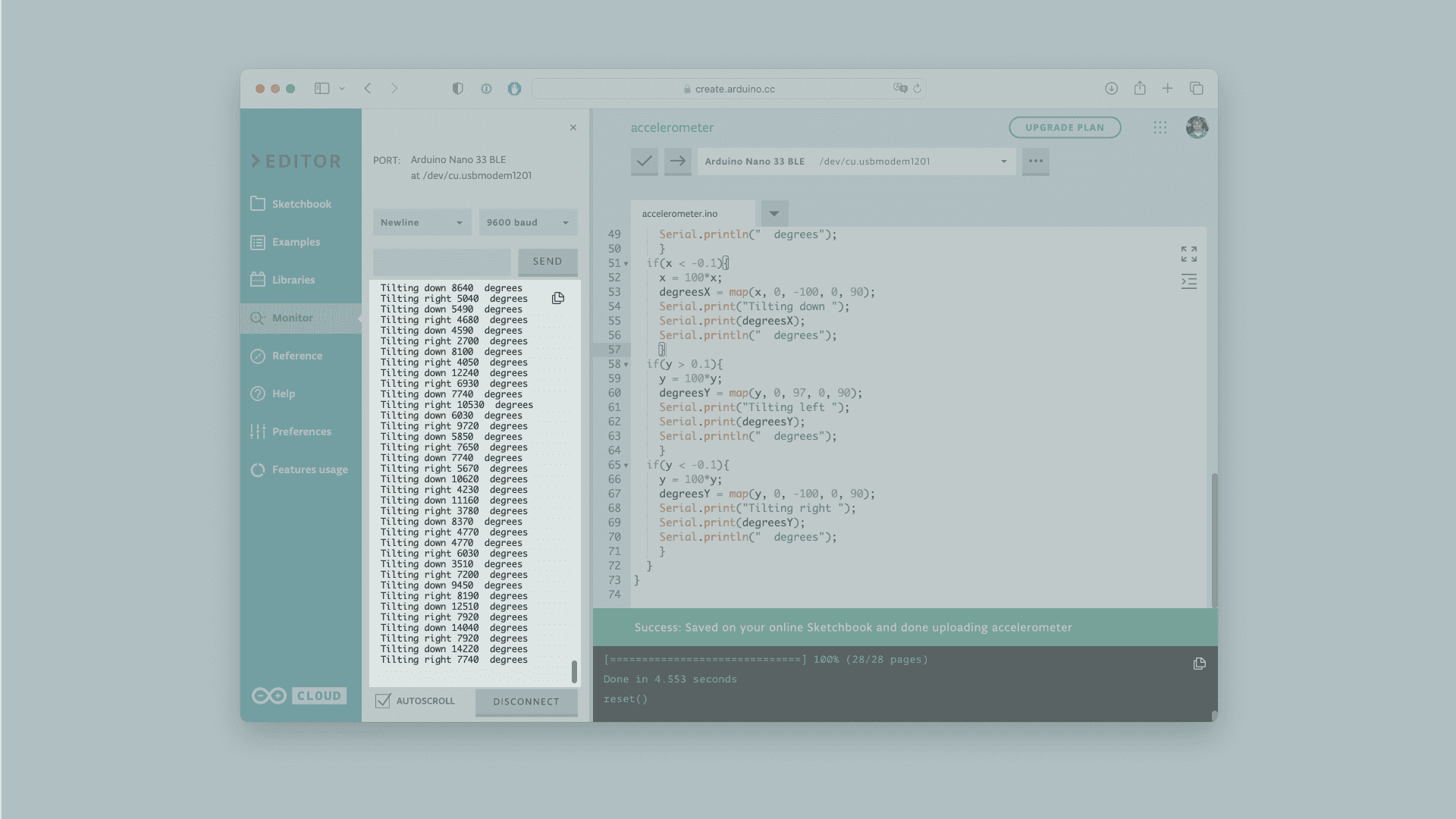 Now, you can verify and upload the sketch to the board and open the Monitor from the menu on the left.