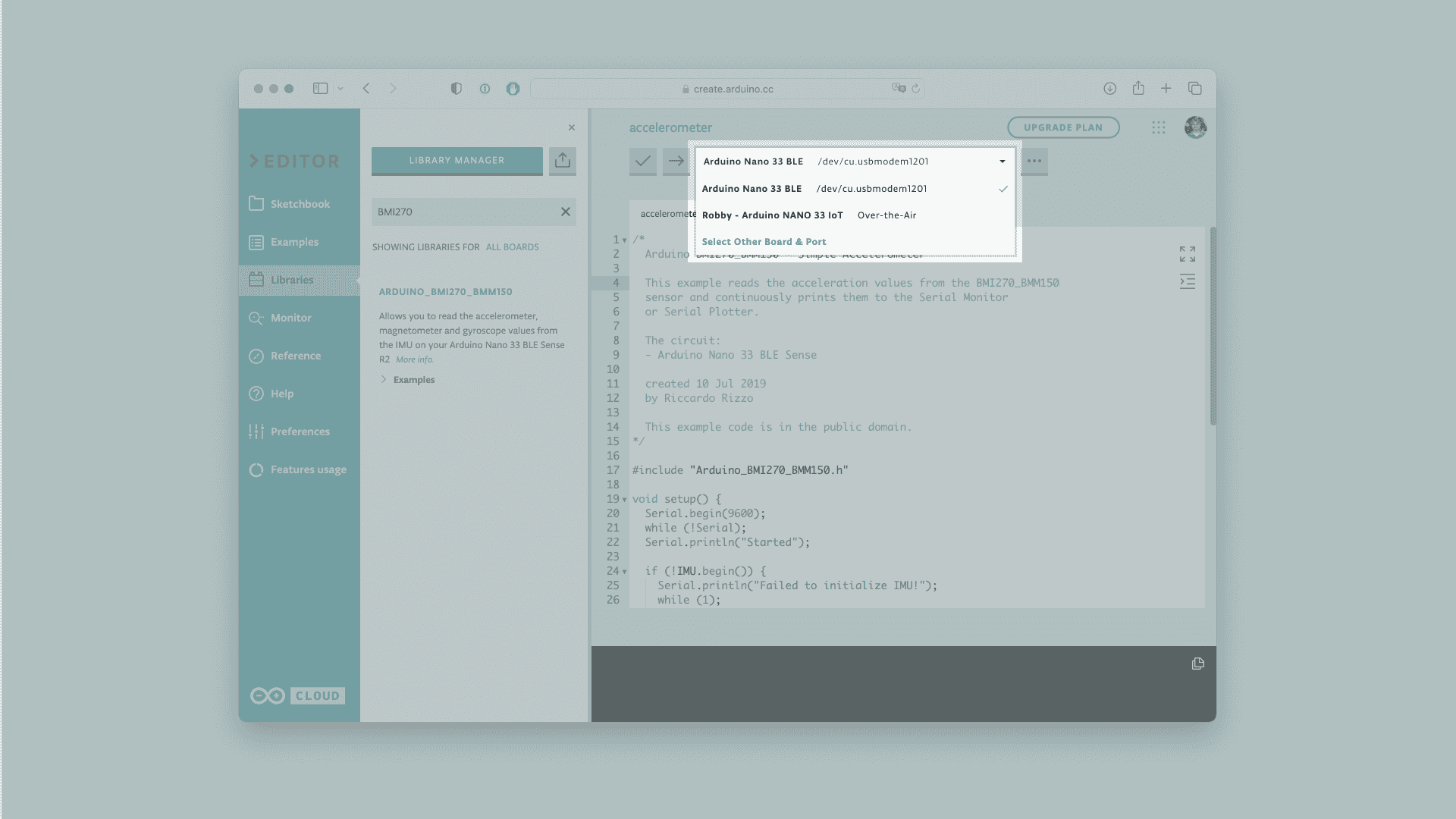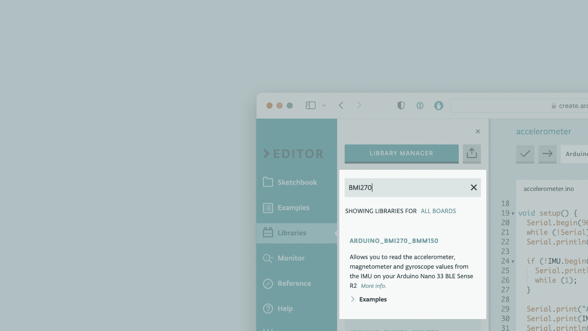 Let's start by opening the Arduino Web Editor, click on the Libraries tab and search for the BMI270_BMM150 library. Then in > Examples, open the SimpleAccelerometer sketch and once it opens, rename it as Accelerometer.