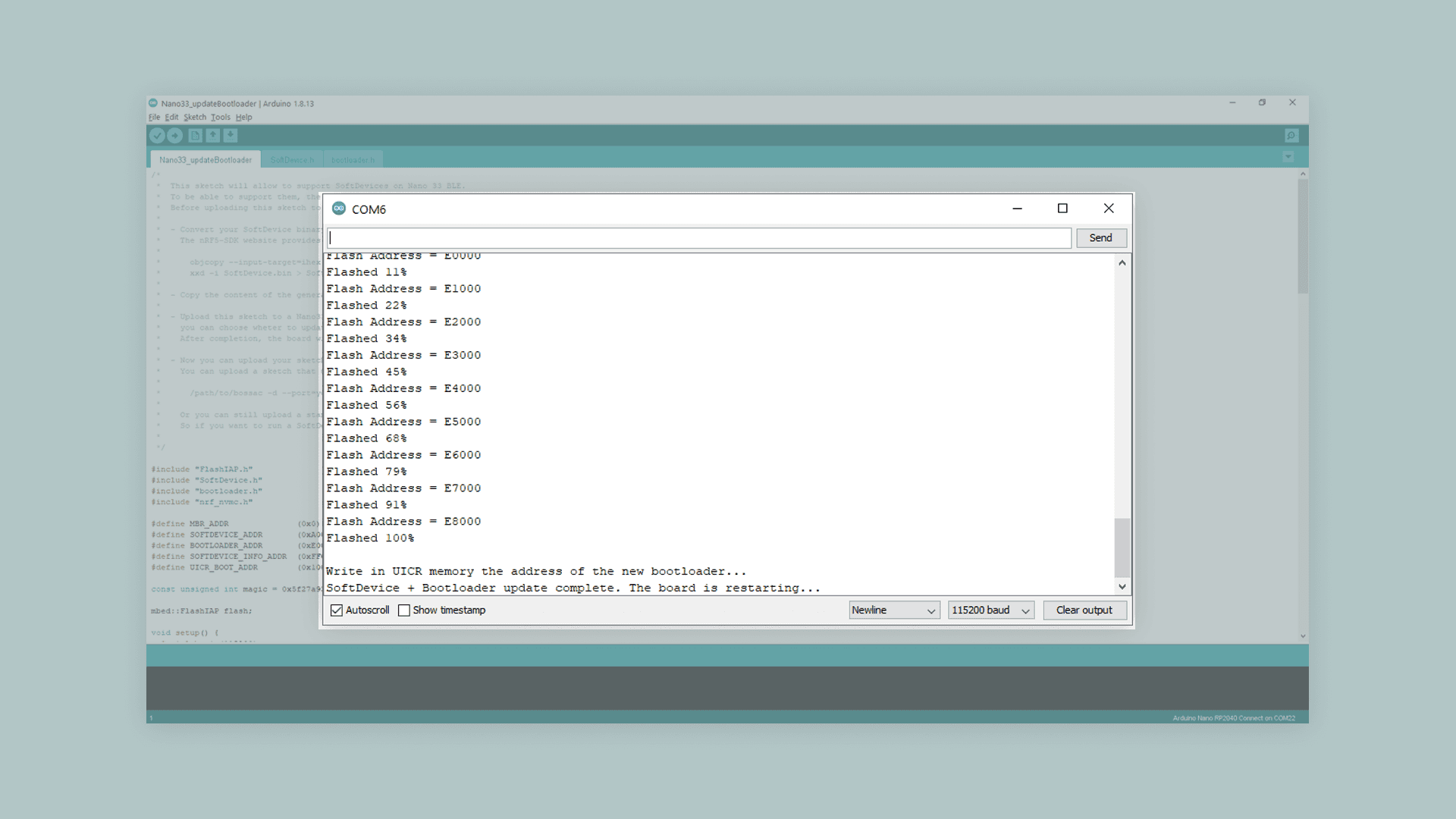 Upload the sketch to your board and open the serial monitor. If you haven't installed the latest bootloader yet, in the serial monitor you will get the option to do so. Enter "y" into the serial monitor and press the return key. Once the process is done, you will be asked if you want to install the softdevice. Enter "y" and press the return key. Wait for the update to finish. Your board will restart when the process is done and put itself into bootloader mode.