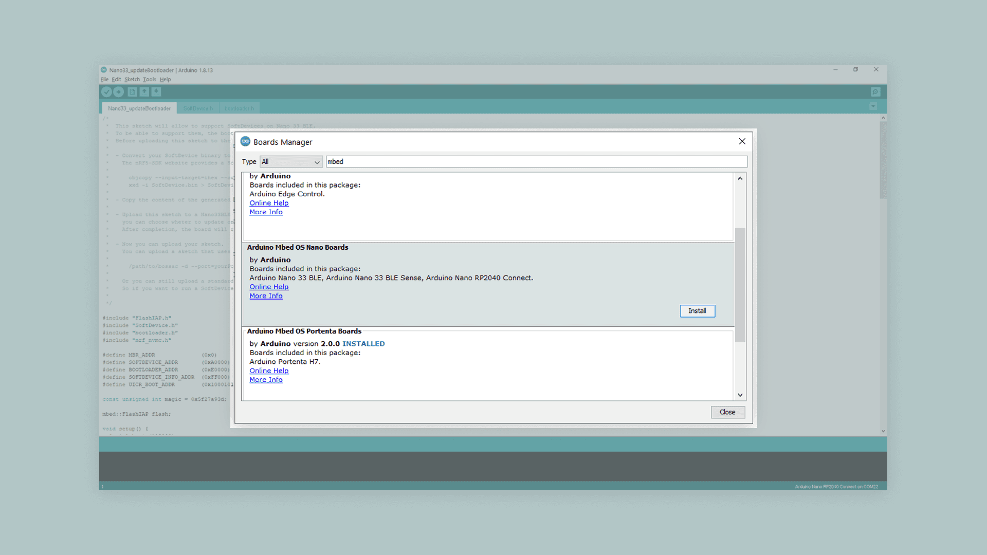 With your board connected, open up the Arduino IDE. This step is the same for both the IDE 1 and the IDE 2. Open the board manager and search for "mbed". Find the "Arduino Mbed OS Nano Boards" Board Package and click on "Install" to install the latest version.