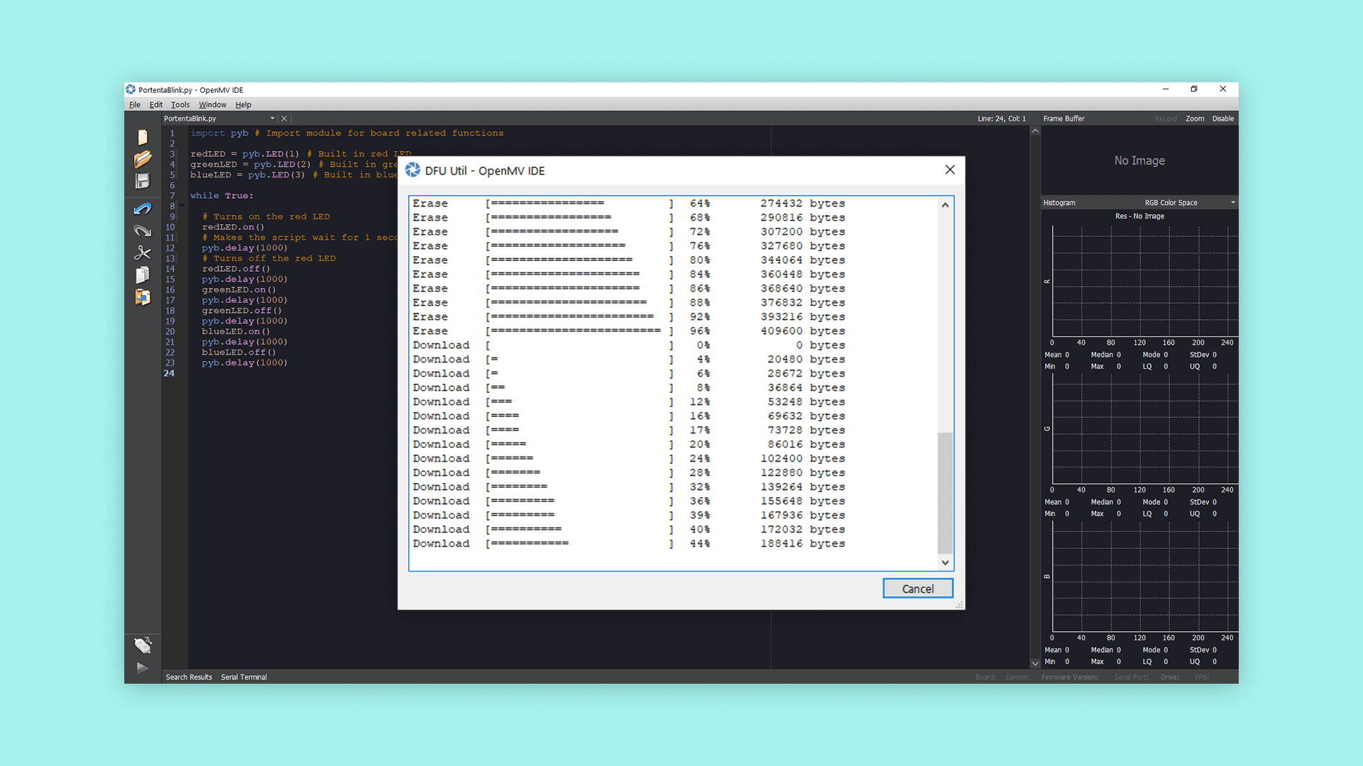 This tutorial will show you how to update the bootloader with an Arduino IDE sketch. This is required to run the OpenMV firmware. It shows you how to connect the board in OpenMV and upload a MicroPython script that controls the built-in RGB LED.