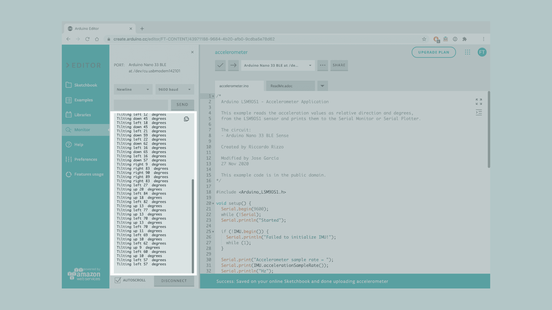 Let's start by opening the Arduino Web Editor, click on the Libraries tab and search for the LSM9DS1 library. Then in > Examples, open the SimpleAccelerometer sketch and once it opens, rename it as Accelerometer.