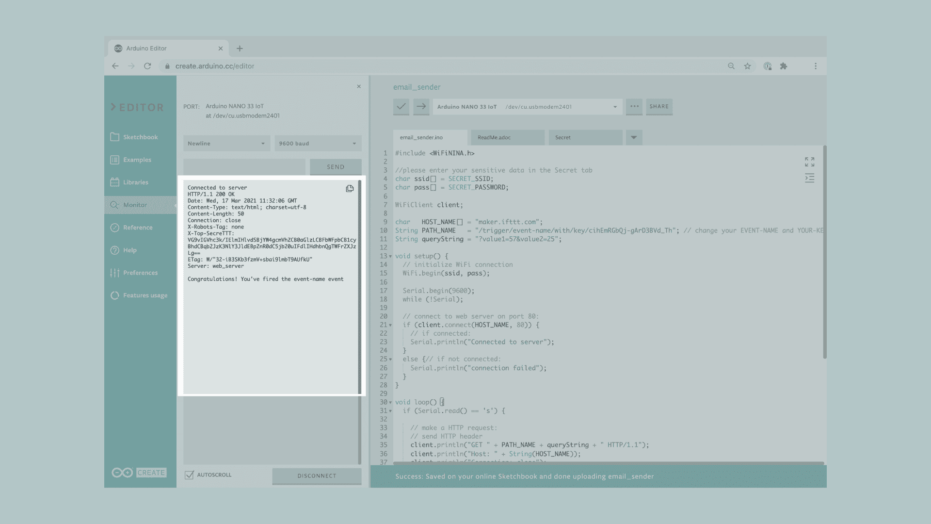 • Learn how to send an email from the Arduino Web Editor using online automation tools.
