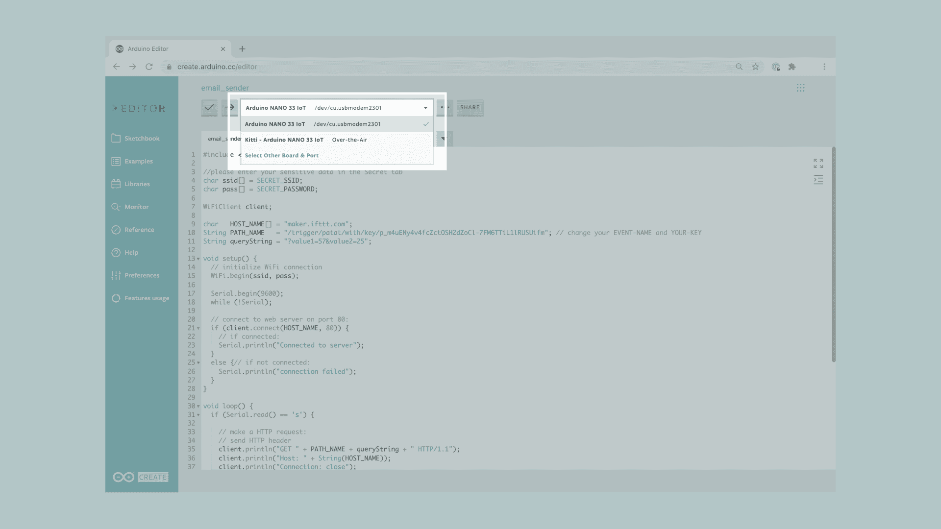 Next, connect the Arduino Nano 33 IoT to the computer and make sure that the Web Editor recognizes it. If so, the board and port should appear as shown in the image below. If they don't appear, follow the instructions to install the plugin that will allow the Editor to recognize your board.