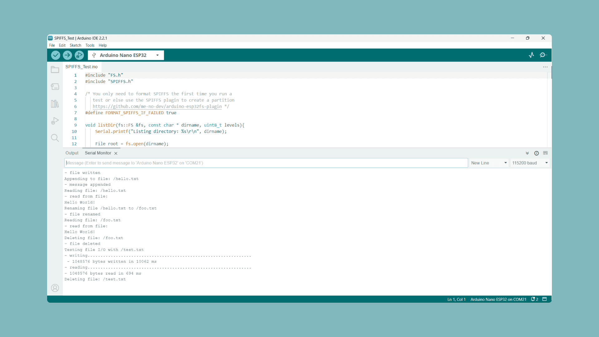 1void setup(){2 Serial.begin(115200);3 if(!SPIFFS.begin(FORMAT_SPIFFS_IF_FAILED)){4 Serial.println("SPIFFS Mount Failed");5 return;6 }7 8 listDir(SPIFFS, "/", 0);9 writeFile(SPIFFS, "/hello.txt", "Hello ");10 appendFile(SPIFFS, "/hello.txt", "World!\r\n");11 readFile(SPIFFS, "/hello.txt");12 renameFile(SPIFFS, "/hello.txt", "/foo.txt");13 readFile(SPIFFS, "/foo.txt");14 deleteFile(SPIFFS, "/foo.txt");15 testFileIO(SPIFFS, "/test.txt");16 deleteFile(SPIFFS, "/test.txt");17 Serial.println( "Test complete" );18}