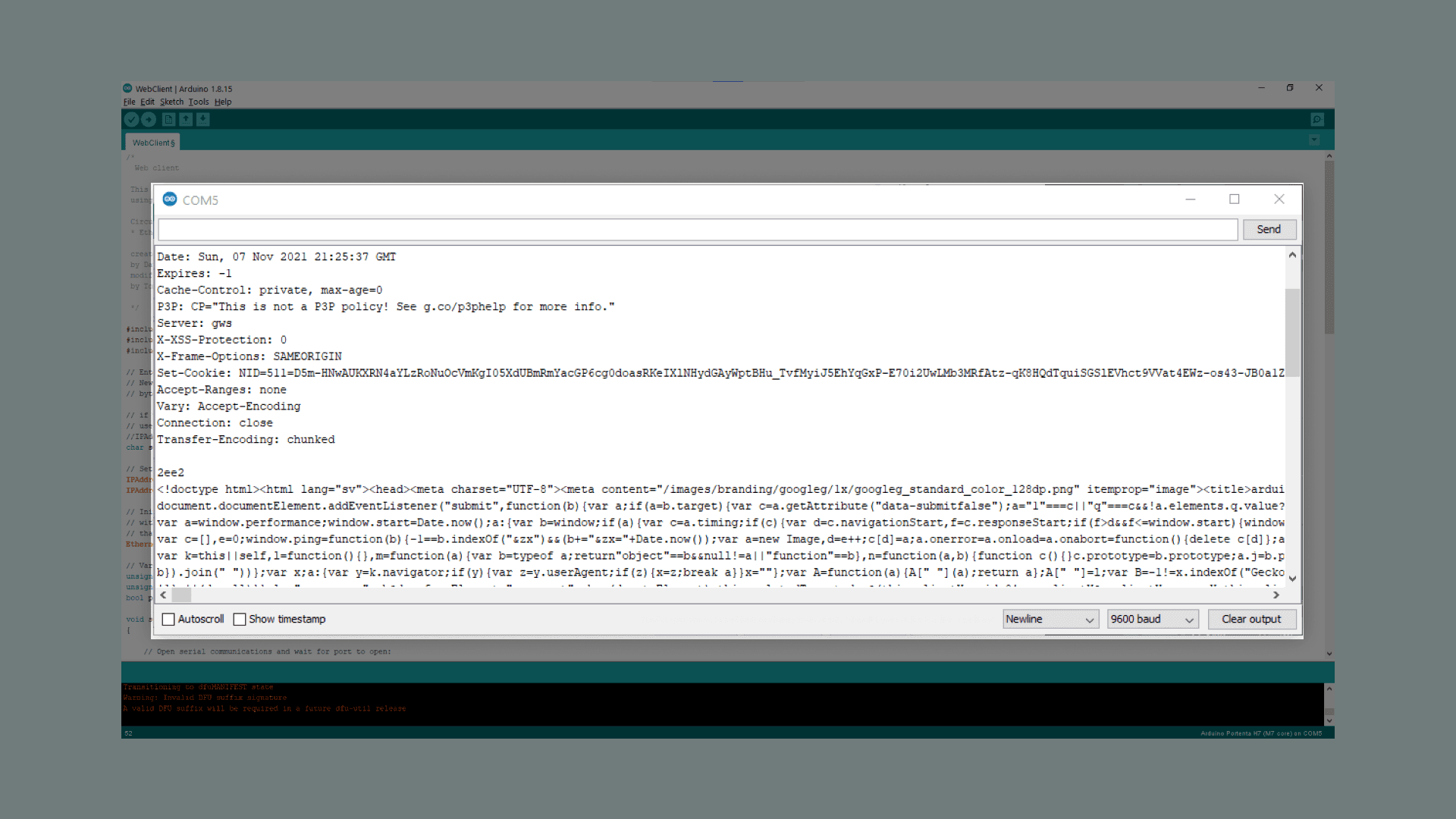 After the board has printed all of the websites content, it will automatically disconnect. The sketch will at the end calculate the speed at which bytes were received and print the results in the Serial Monitor.